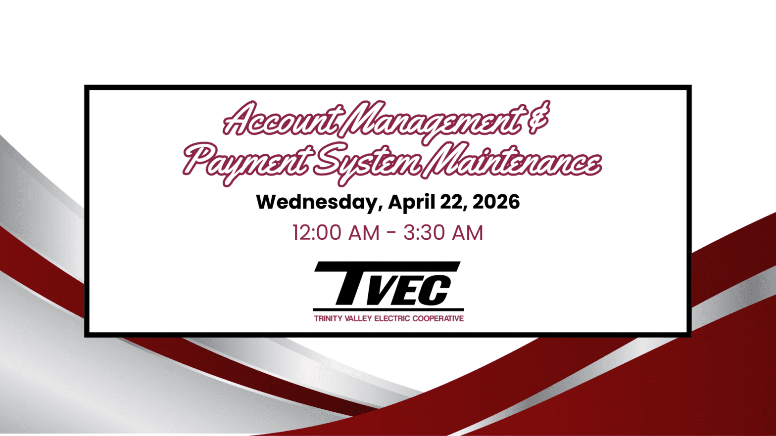 We’ll be doing a little behind-the-scenes maintenance on our account management and payment systems on Wednesday, April 22, from 12:00 a.m. to 3:30 a.m.During this time, access through our website, SmartHub app, and automated phone services will be temporarily unavailable.The good news? Outage reporting will NOT be affected. You can still report outages by calling 800-967-9324 […]