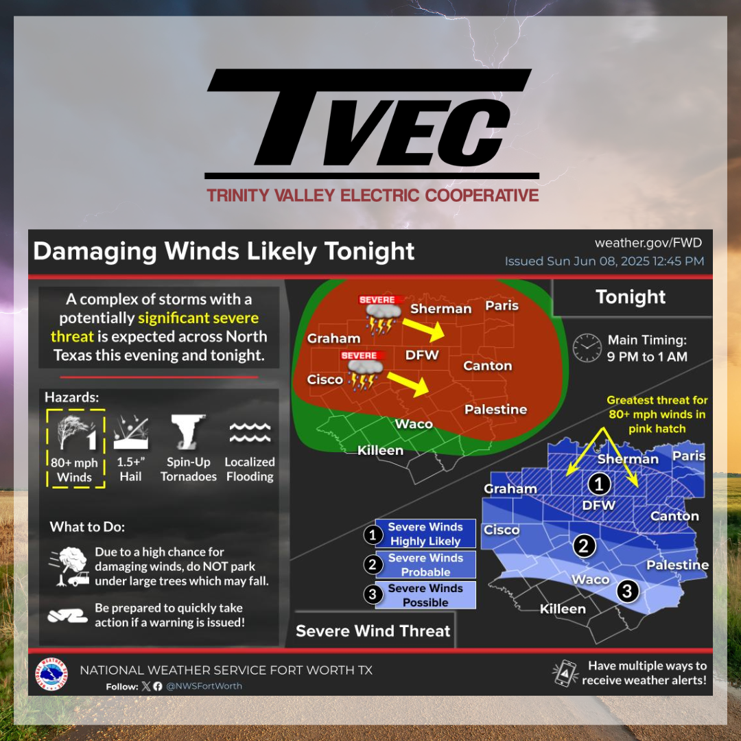 A strong storm line moves into TVEC’s service area tonight. Here’s what to expect